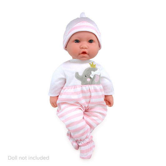 JC Toys Berenguer Boutique Baby Doll Outfit Pink Elephant Themed Hooded Onesie Fits dolls 14"- 18"